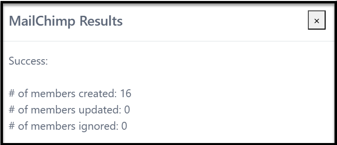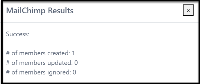 You should get a Mailchimp Results message. You should see the names and emails you sent in the appropriate audience in Mailchimp (this may take a few moments. If you had Mailchimp open, you may need to press refresh). You will now finish and send your emails from Mailchimp directly.