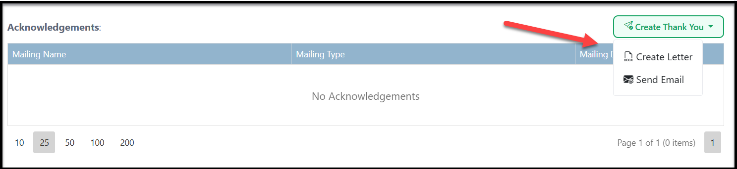 - Click Create Thank You, then choose whether you would like to Create a Letter or Send an Email.