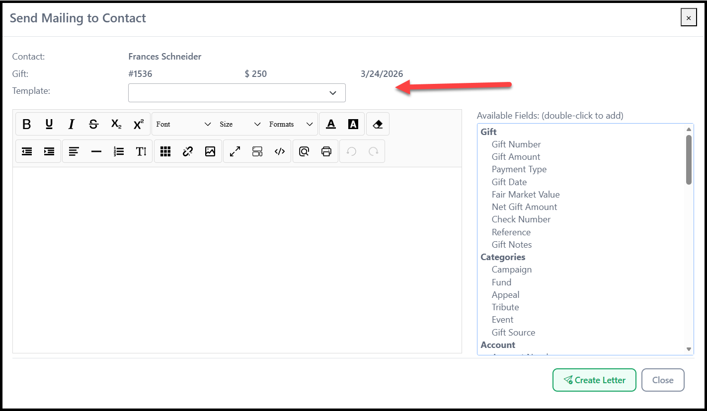 A window will appear displaying the contact’s name, gift number, amount, and date. From here, you can either choose an existing Letter Template from the dropdown or create your message from scratch.