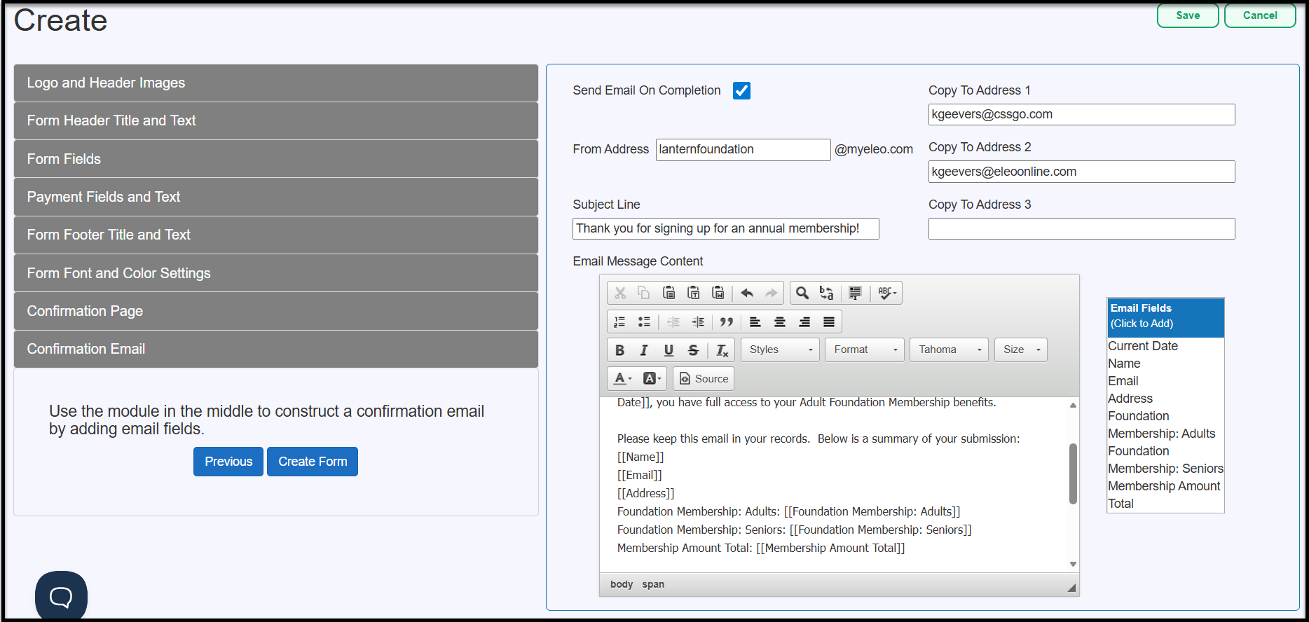 - Write the body of your email and include form fields (selected from the right-hand side).