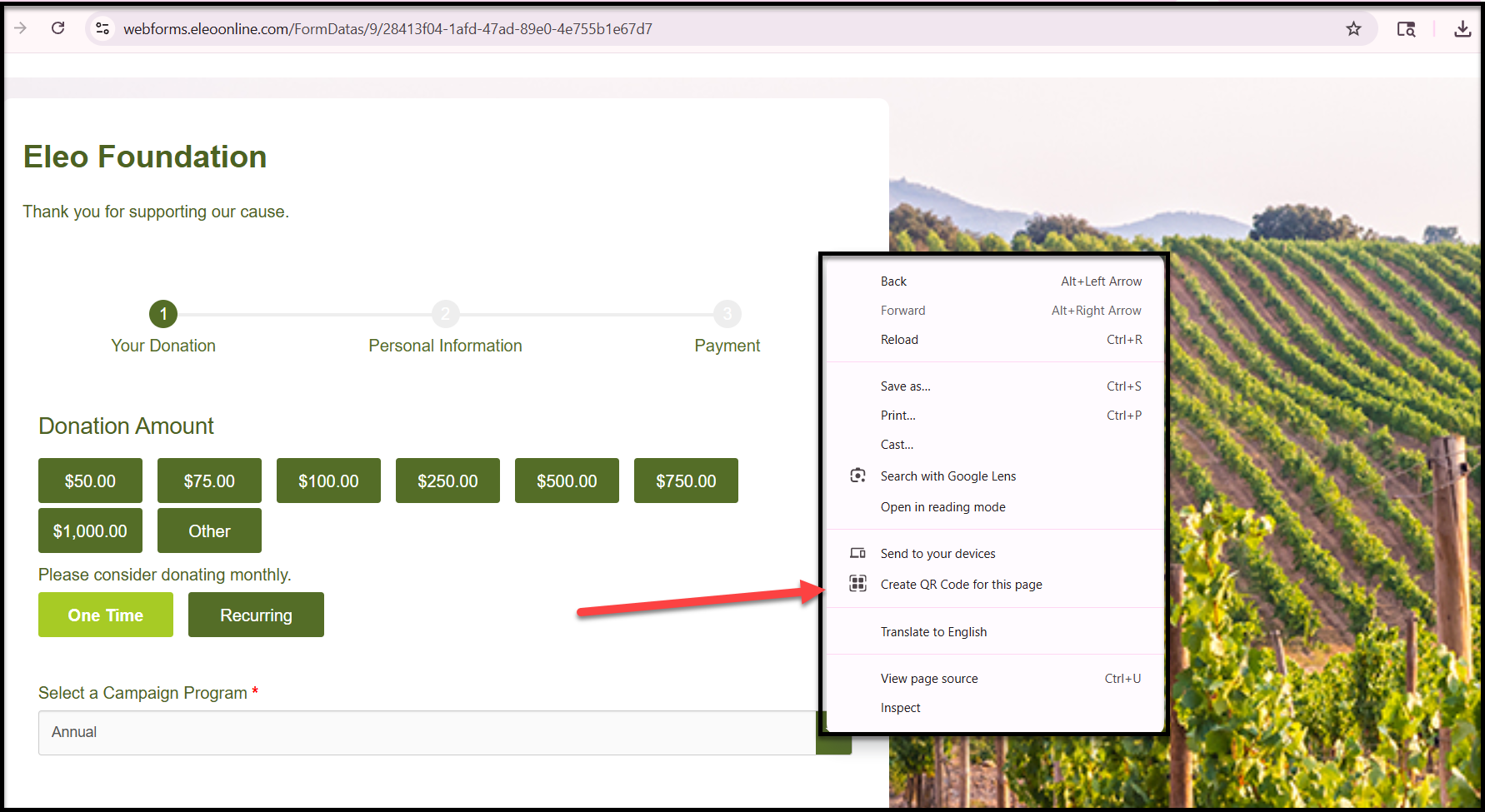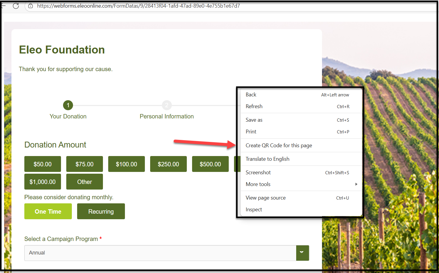 QR codes make it easy for donors and supporters to access your Eleo web forms from printed materials, emails, or events. You can create a QR code for any Eleo web form link directly from most modern web browsers; no third‑party tools required.