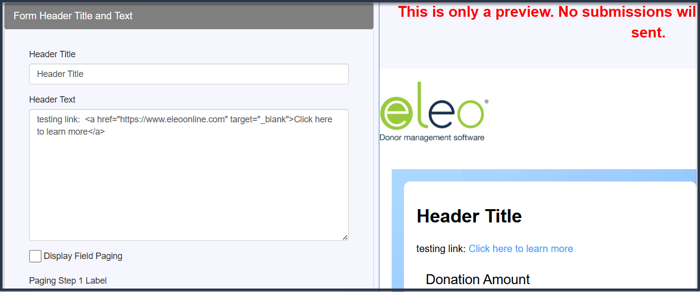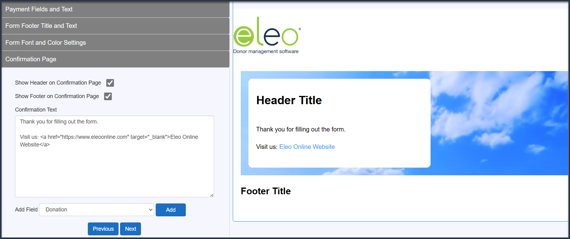 You can add hyperlinks to your Eleo Web Form using simple HTML. The example below shows how to add one to the Confirmation Page, but you can also use this method in the Header, Footer, and other form sections.