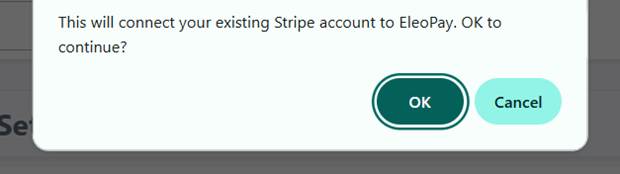 3. Click on the radio button next to “EleoPay powered by Stripe.” Then, click Connect Existing Stripe Account. A pop-up will appear. Click “OK” to continue.