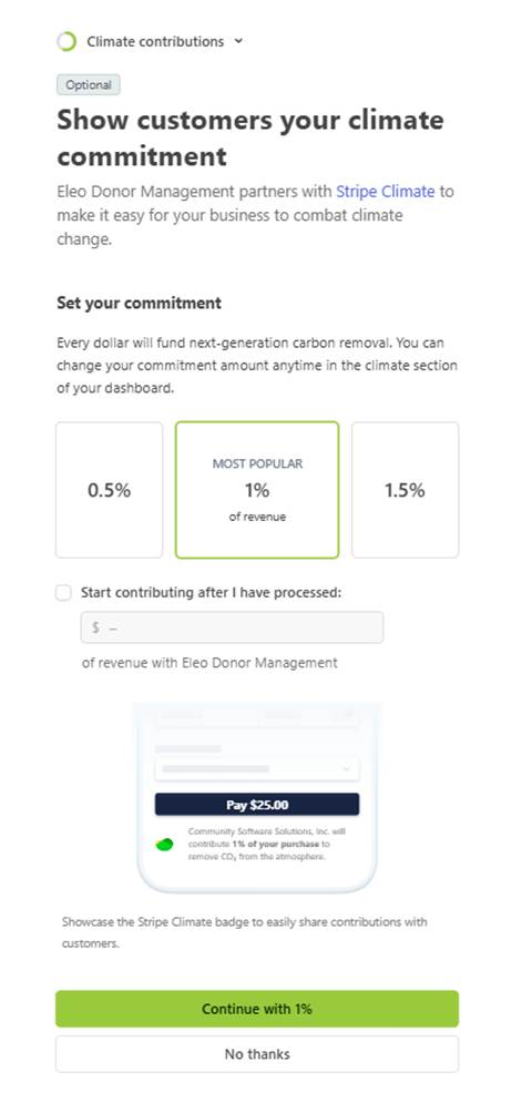 8. The next page is regarding Stripe’s Climate Commitment. Fill this out based on how you want to proceed or click No Thanks.
