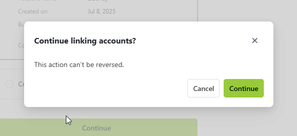 7. Next, it will ask if you want to link this account. Make sure the account is selected and click Continue. A popup will appear, letting you know this action can’t be reversed. Click Continue.
