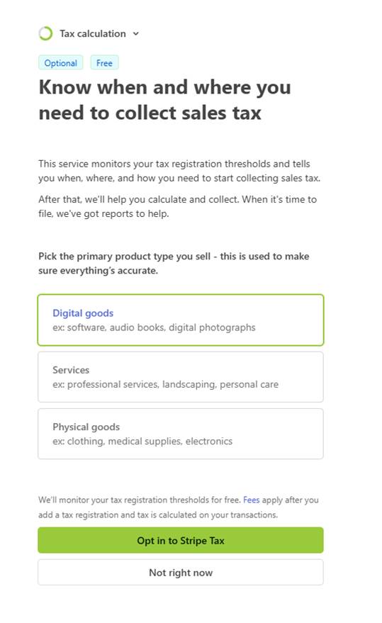 9. The final page is regarding tax calculation. This section will not apply to your organization. Click Not Right Now.