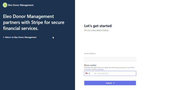 - You will now begin your Stripe application! Insert your email and phone number and click Submit.