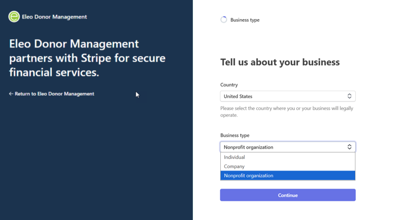 - Enter the information requested regarding your nonprofit organization and click Continue.