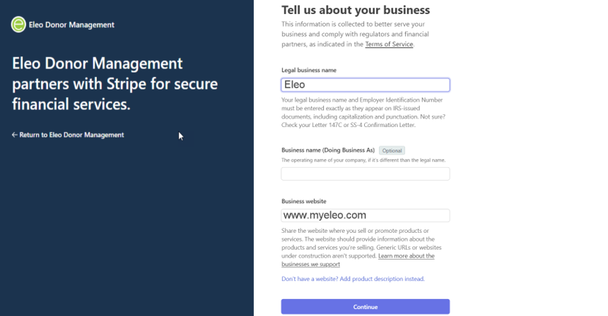 And that is it! You have successfully created a new Stripe account and linked it to your Eleo database. You can now create a web form and start accepting payments. 😊