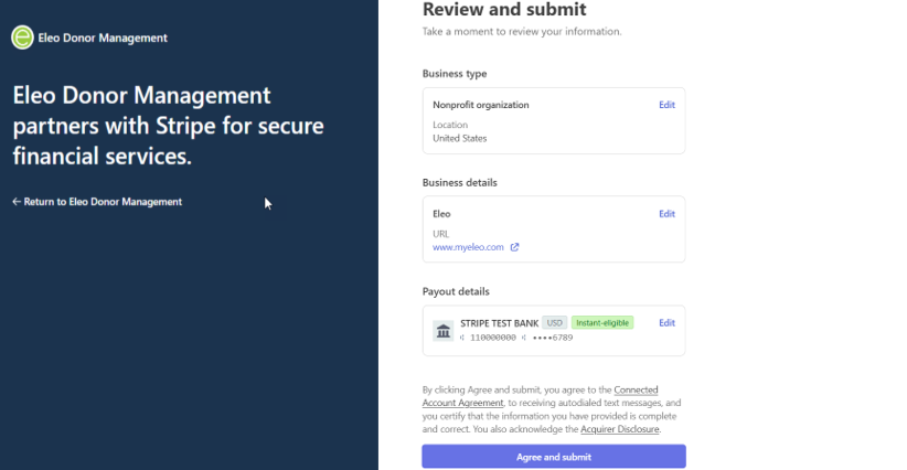- You have reached the final page of the Stripe application. Please review the information and click Agree and Submit. NOTE: Please ensure your EIN number is entered under Business Details. This is required to receive the non-profit processing rate.