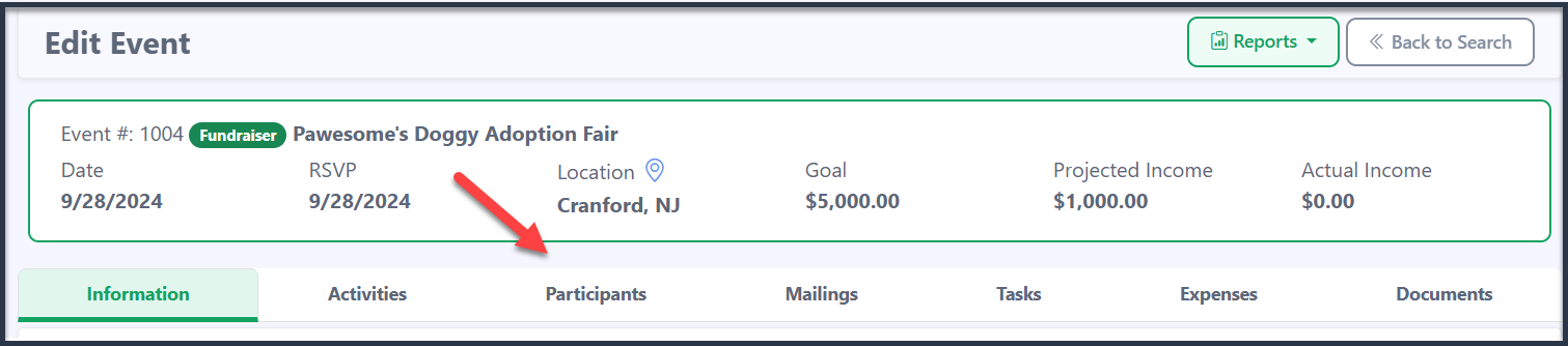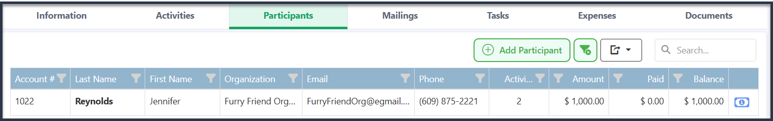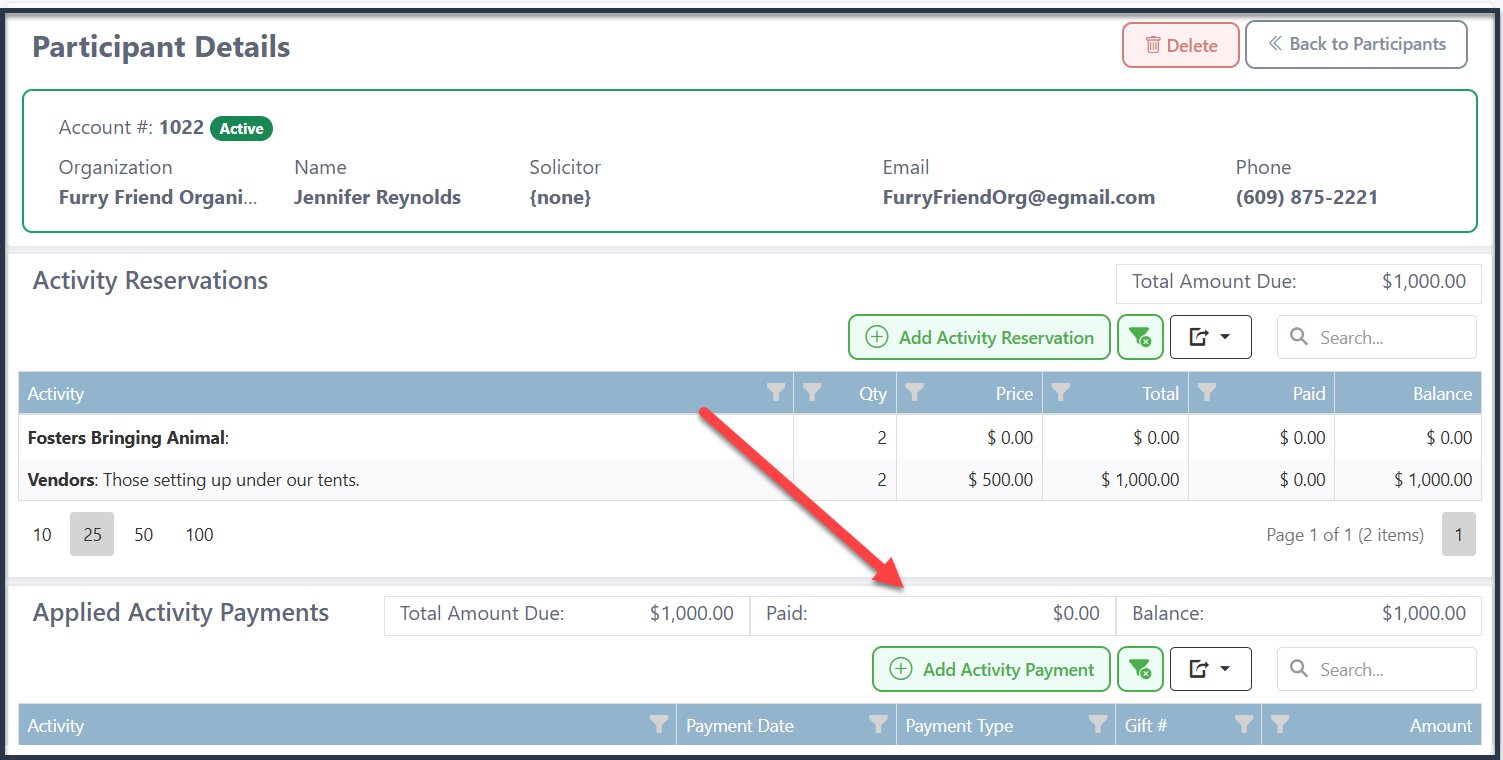 5. This will open up their Participant Details. Click on the Add Activity Payment button.