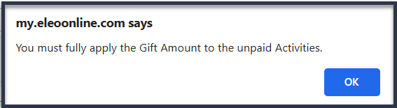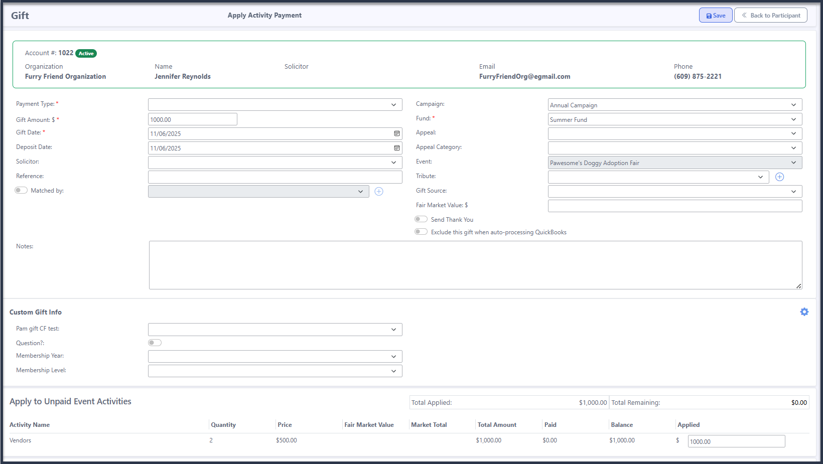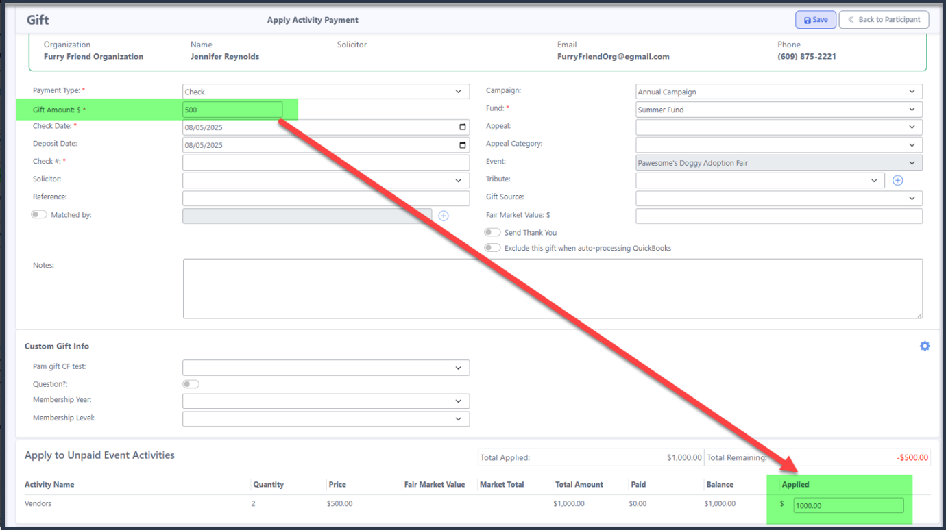 Important: In the Apply to Unpaid Event Activities section at the bottom, update the Applied amount to match the amount of this gift.