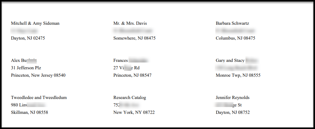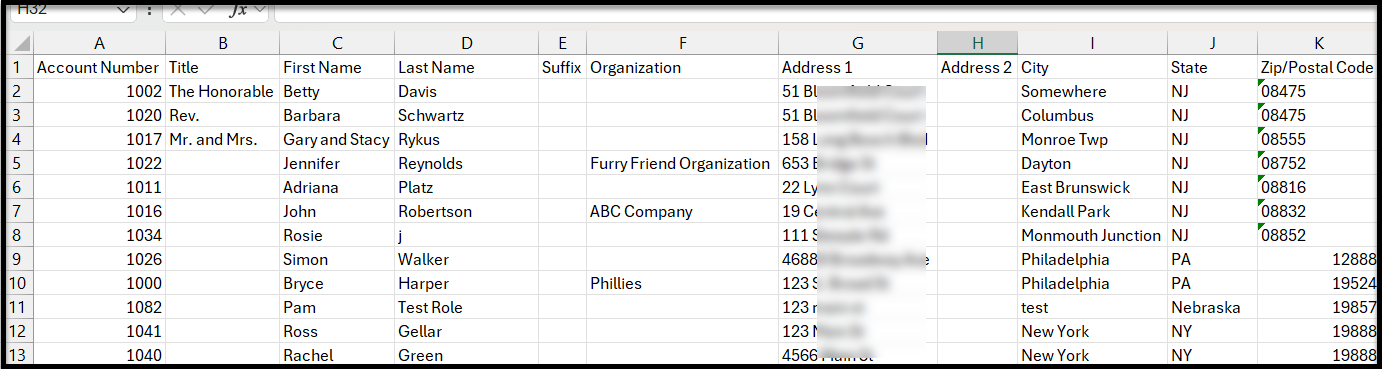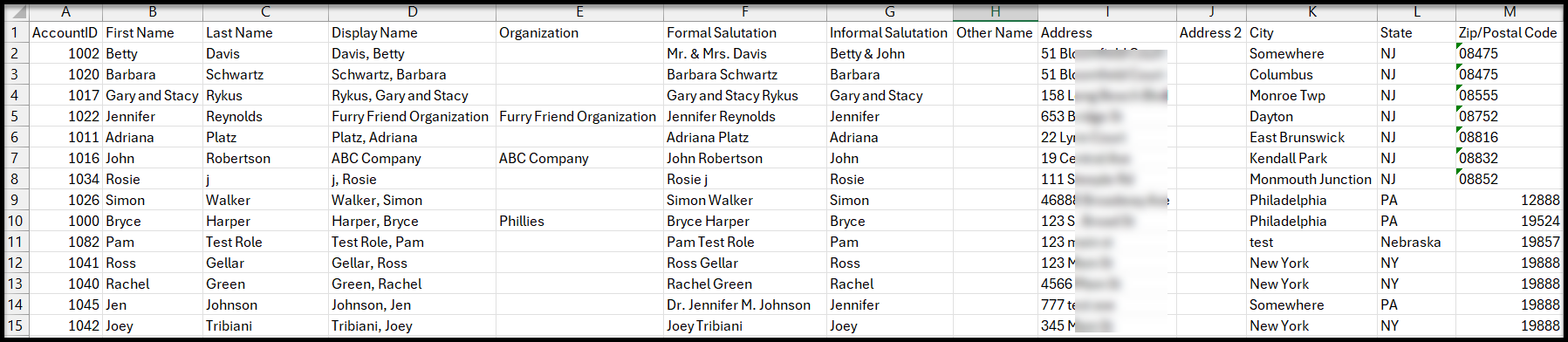 3) This will download an Excel CSV file of data. It contains the following standard fields: Account ID, First Name, Last Name, Display Name, Organization, Formal Salutation, Informal Salutation, Other Name, Address, Address 2, City, State, and Zip/Postal Code.