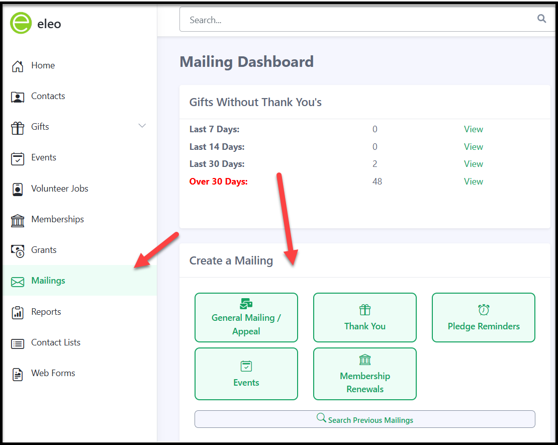 2) Choose Mailings in the main navigation on the left. Select the type of mailing you would like to create under Create a Mailing. If you need help with this process, see How to Create a Mail Merge Mailing.