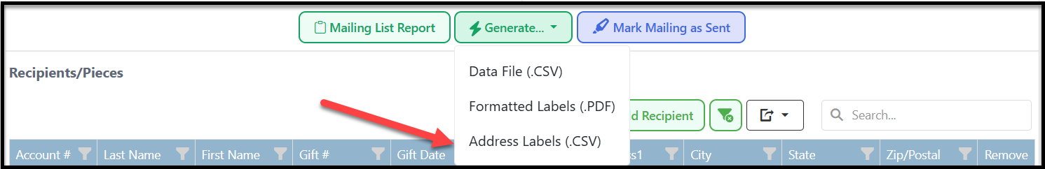 2) When you get to the final mailing step, you will see a screen like this. Choose Generate and then Address Labels (.CSV).