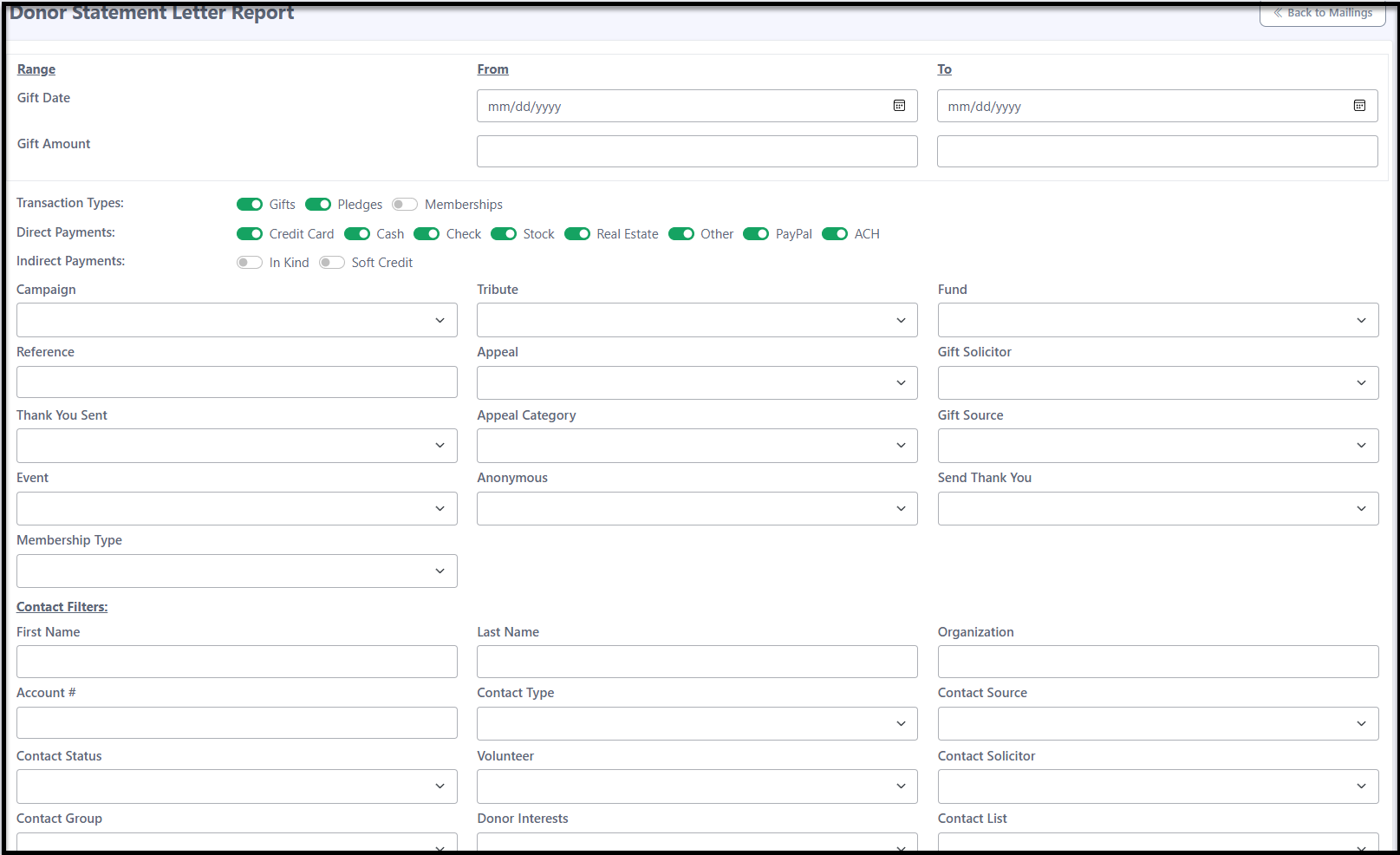 Important: The Gift Amount filter applies only to individual gifts. If you want to filter by a donor’s total giving for the year, start by creating a Contact List. Use the filter Contact > Previous YTD Gift Amount > Greater than or equal to your desired amount. After the list is created, you can select it when running this report to include only those donors.