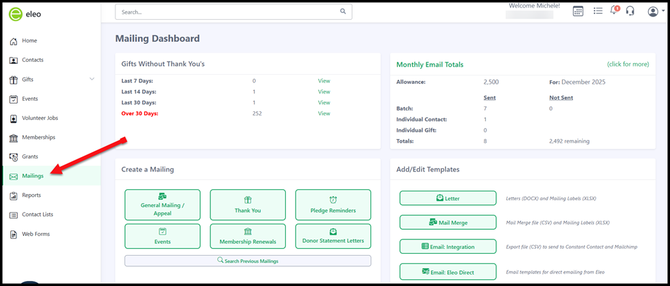 - Click on the Mailings tab on the left-hand side navigation bar in your Eleo database.