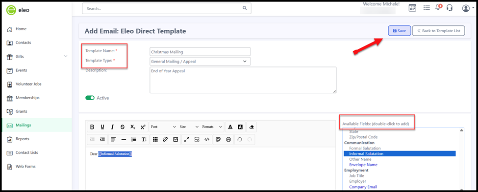 Active: toggle this to on so that you may use this template in your Mailings Module.