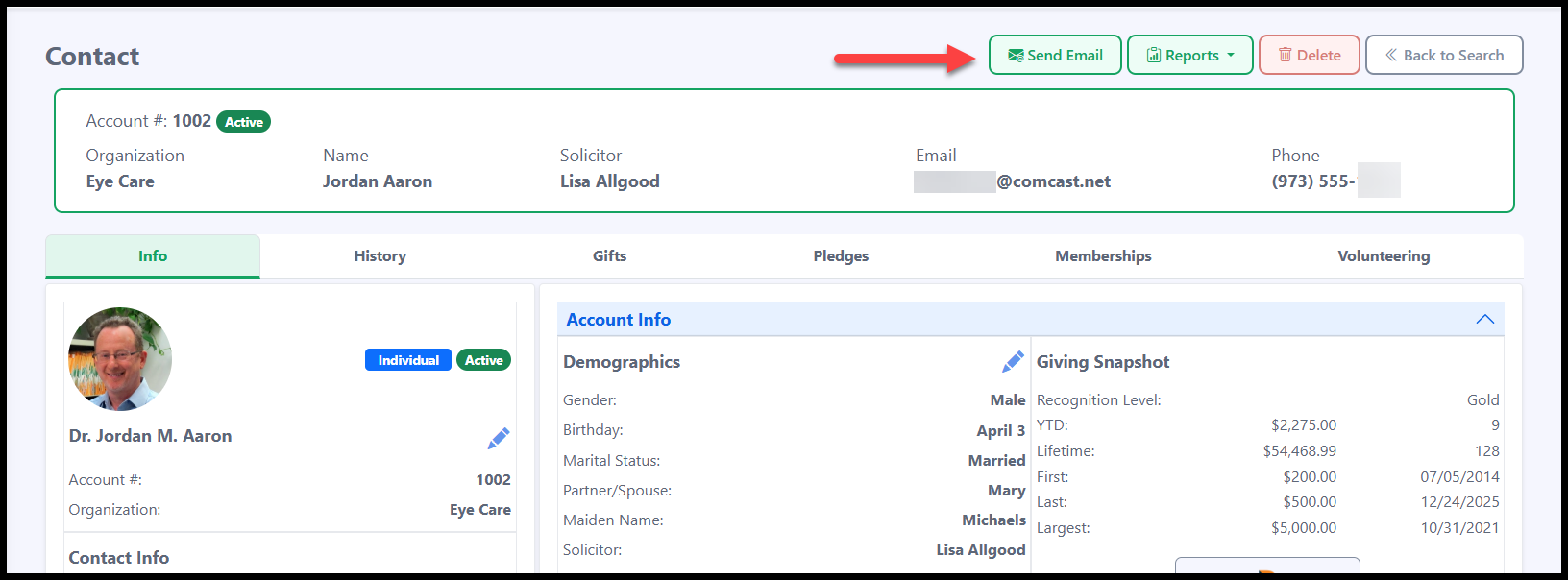 One-off emails can be sent directly from a contact record as long as there is an email address associated with that contact.