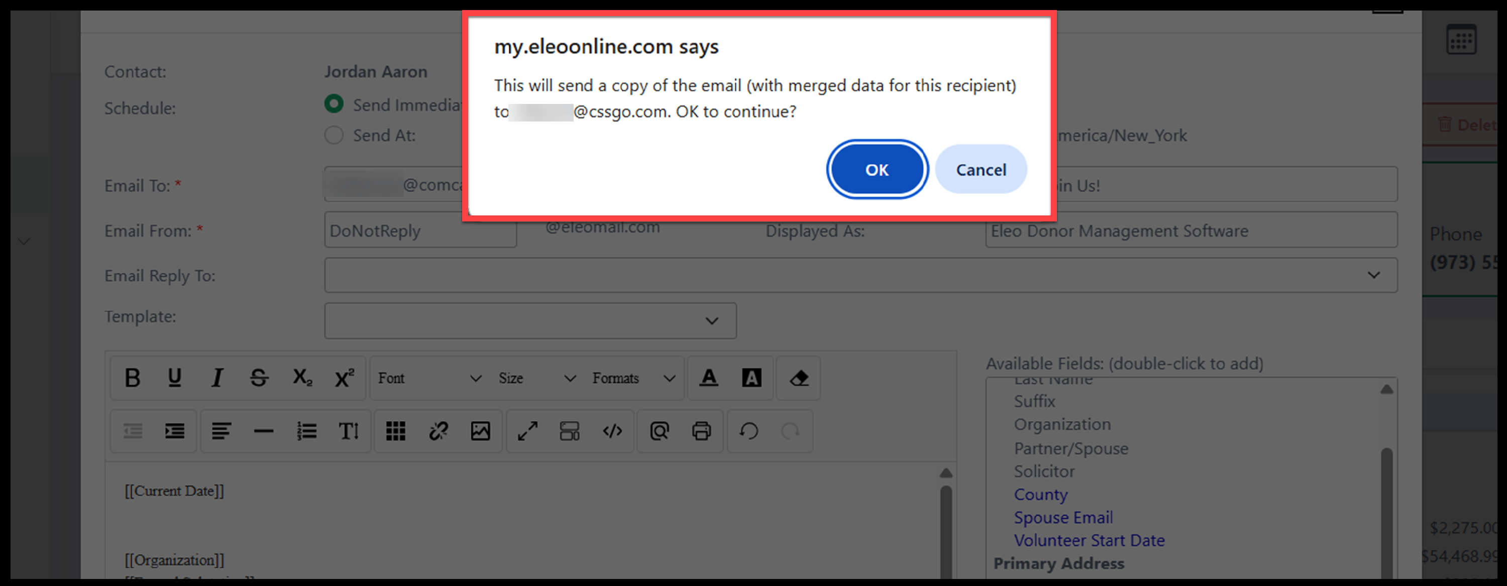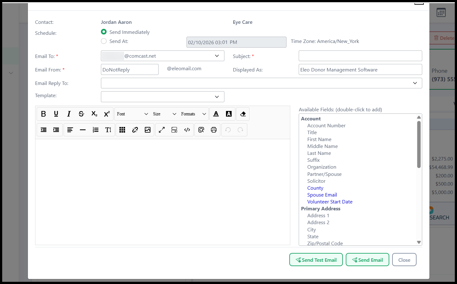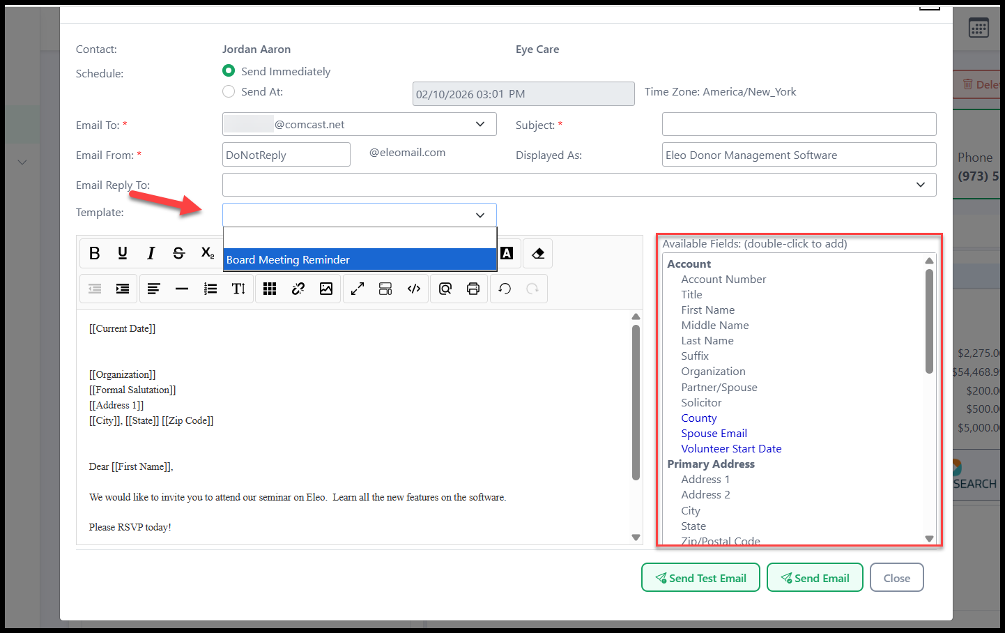 To create the body of the email, you would use the Available Fields located on the right. These fields will populate with the specific information for this contact. OR you can create and use a template. Templates can be selected from the dropdown.