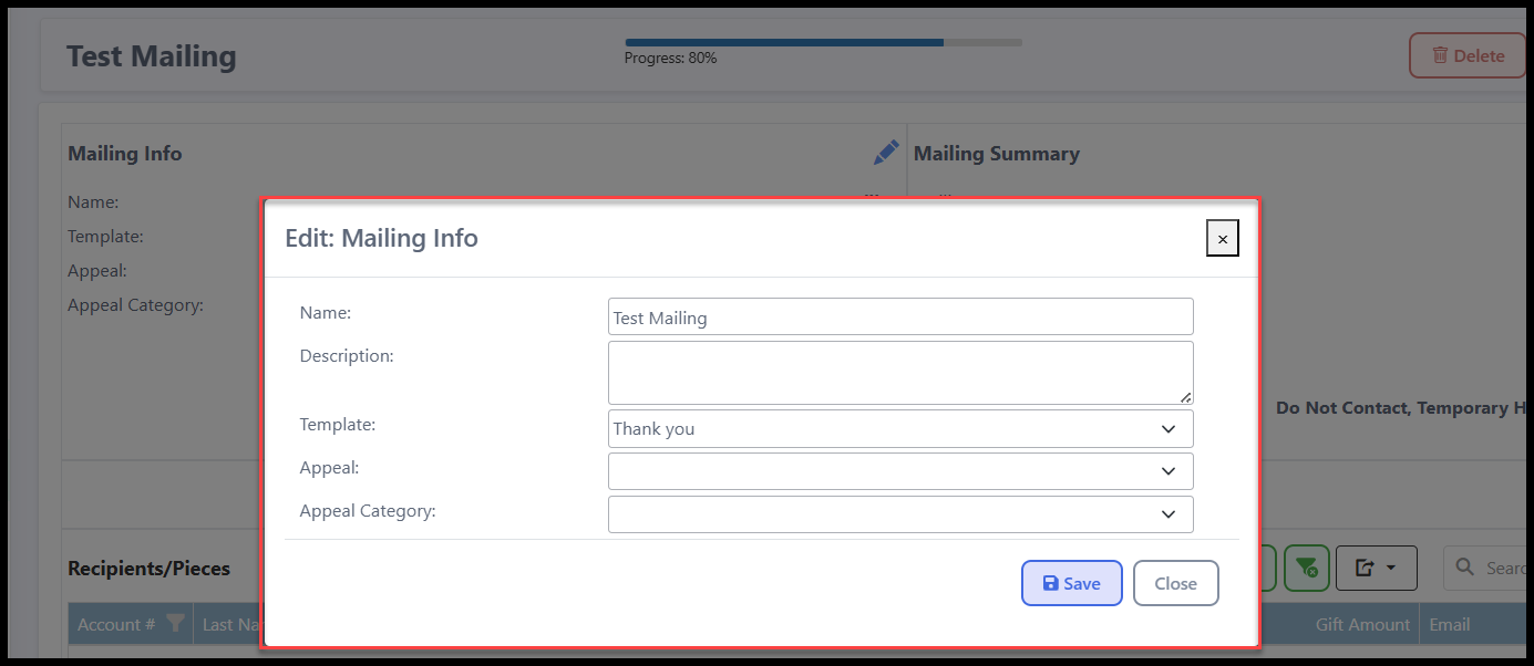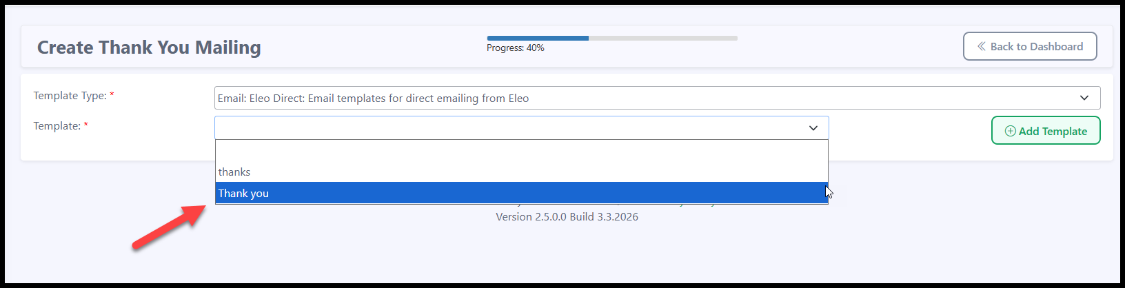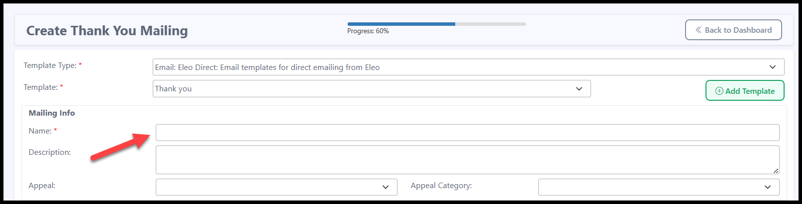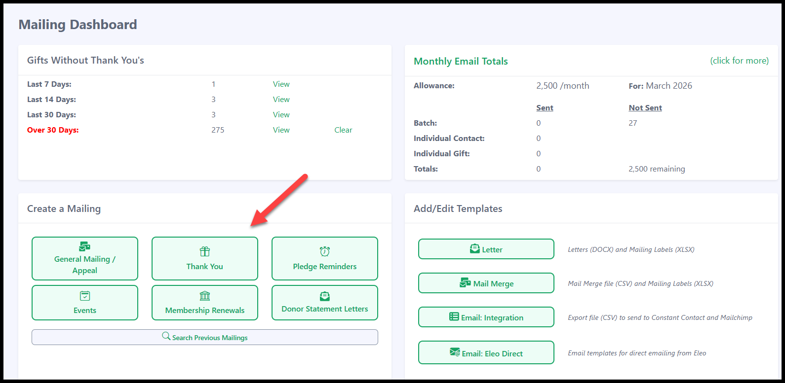 - When creating a mailing, choose the type of mailing you will be working on. This should match the type of template you have created (For example, if you have made a Thank You Email Template, select Thank You).