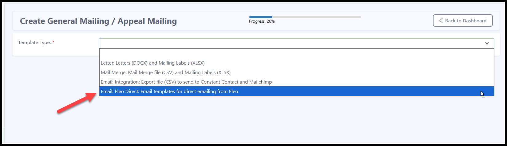 - Under Template Type, select Email: Eleo Direct: Email templates for direct emailing from Eleo).