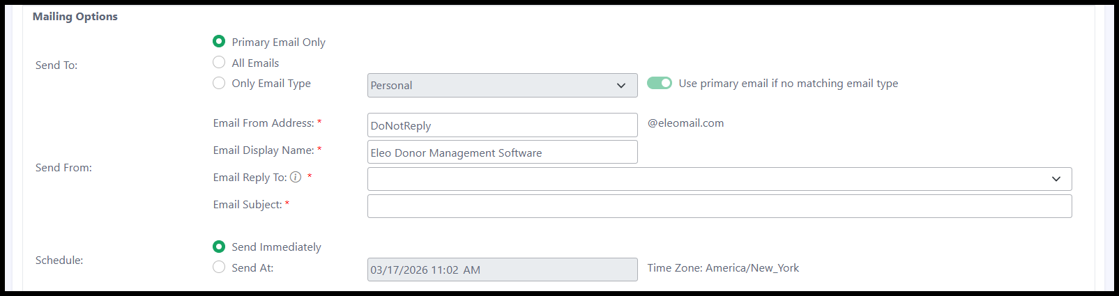 - First, review our guide on How to Create an Eleo Direct Email Template as you’ll need an existing template in your account to proceed through the Mailings Module. This template contains the letter’s content, which will be included in your email.