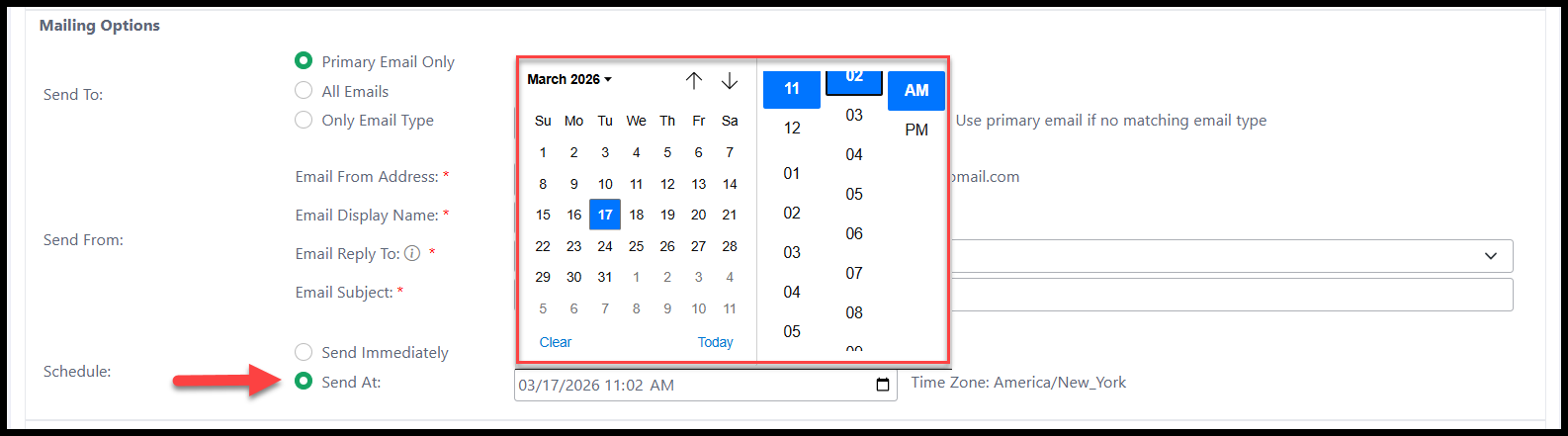 You now have the ability to schedule an email to be sent at a later time or date. When you select the 'Send At' radio button, you will be given the option to set up the email to be sent later.