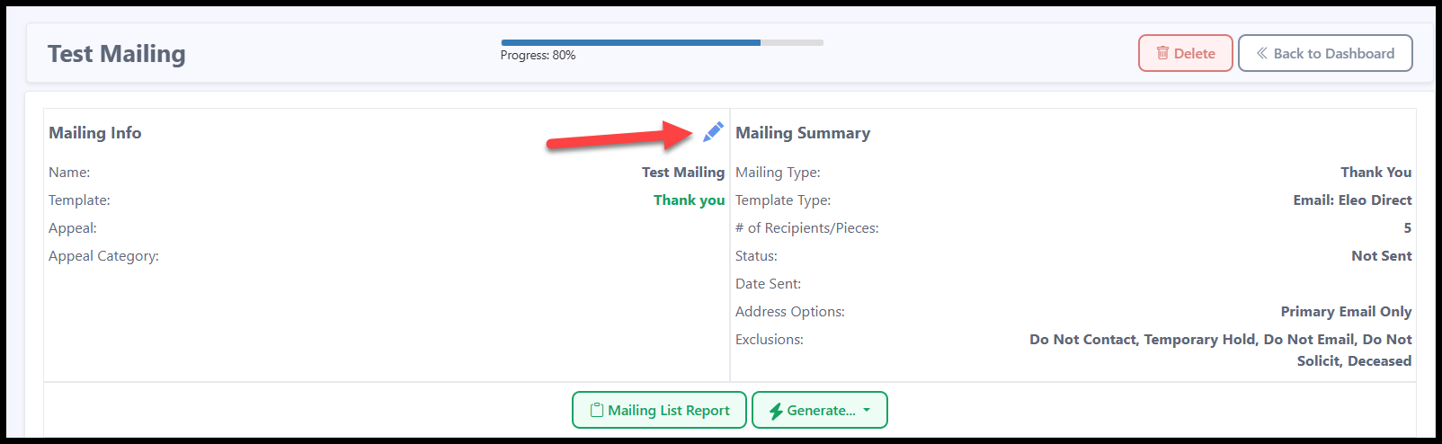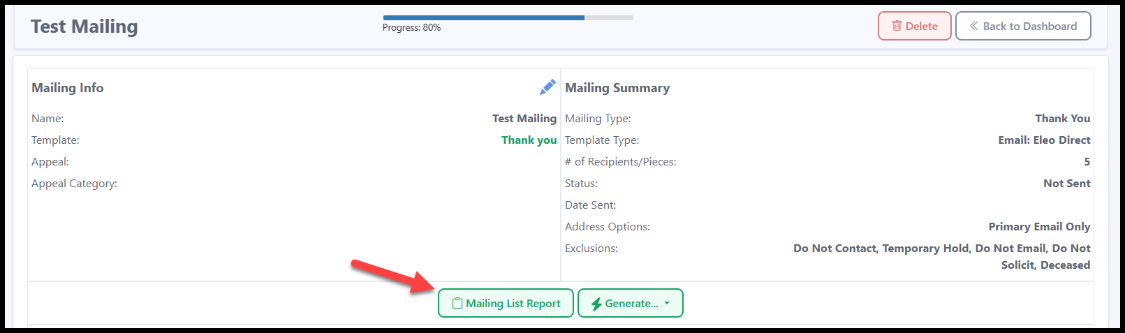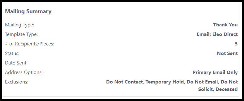 - The Mailing Summary gives you an overview of your mailing (Mailing Type, Template Type, number of Recipients/Pieces, Status, Date Sent, Address Options, and Exclusions).