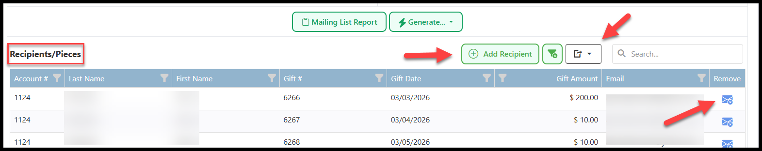 - Under Recipients/Pieces, you can add or remove contacts using the 'Add Recipient' button or the 'Remove Recipient from List' button under the Remove column. This section can also be exported in Excel, CSV, or PDF format using the 'Export Grid Data' icon next to the Search.