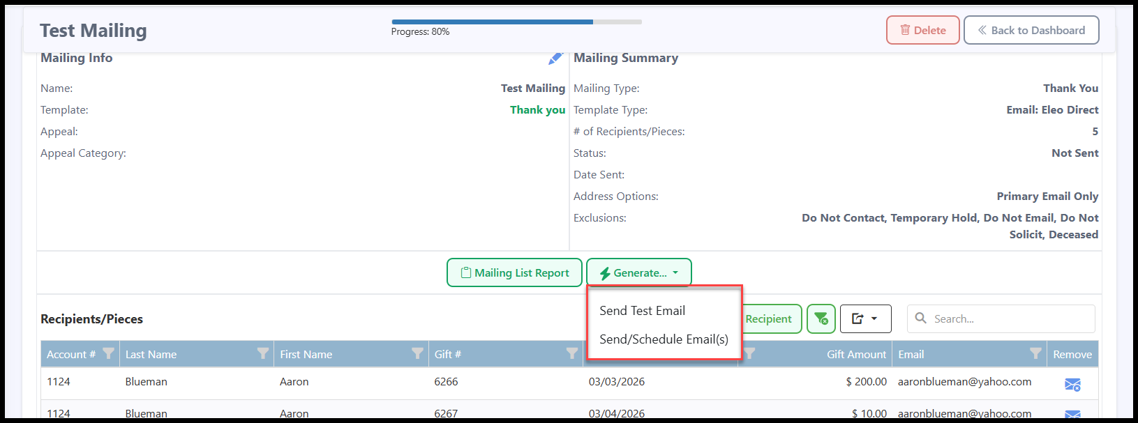 - Send/Schedule Email(s) - This will either send the emails immediately or at a later time/date if you have scheduled that.